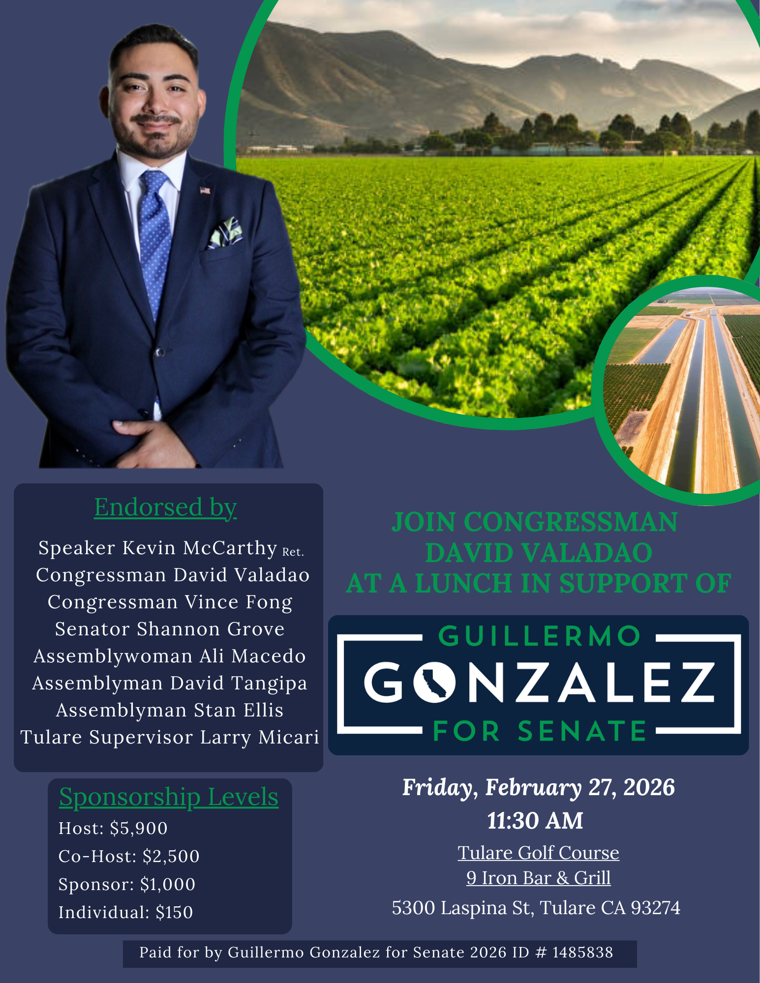 Join Congressman David Valadao at a lunch in support of Gonzalez for Senate 2026 February 27th @ 11:30 AM Tulare Golf Course 9 Iron Bar and Grill RSVP Contribute to Gonzalez for Senate